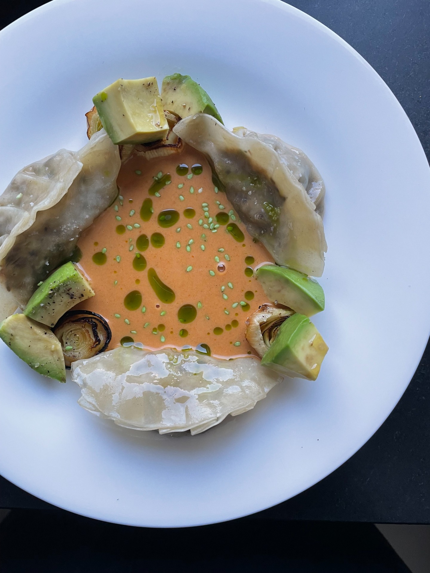 Gyozas maison aux champignons japonais et poireaux, sauce aux épices satay et avocat citronné